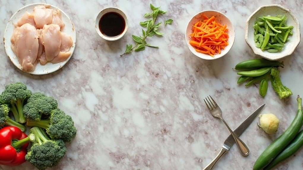 You’ll want to start by preparing your cooking station, with all ingredients measured, chopped, and within arm’s reach. Before heating up your wok, you’ll need to slice your chicken into thin, uniform strips and cut your fresh vegetables into similarly-sized pieces for even cooking. Once your prep work is done, you’re ready to fire up that wok until it’s smoking hot, which is when the real magic of stir-frying begins.