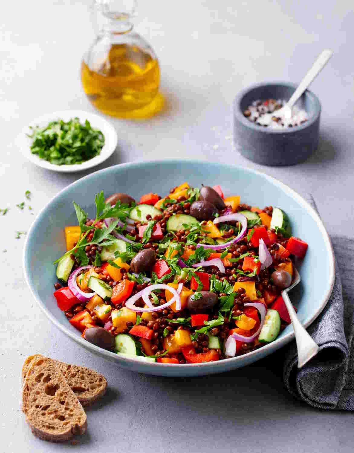 Cool completely before dressing: Hot or even warm lentils will absorb dressing unevenly and can wilt salad greens instantly. Spread cooked lentils on a baking sheet for 15 minutes or use an ice bath to cool them quickly before combining with fresh vegetables and dressing.
